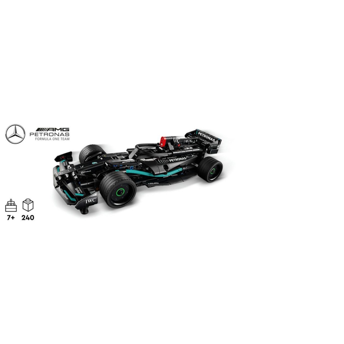 Este modelo da linha Speed Champions reproduz com fidelidade o design do carro de Fórmula 1 da equipe Mercedes-AMG Petronas, com detalhes realistas, pintura autêntica e o sistema de propulsão por retrocesso (pull-back), que permite lançar o carro em alta velocidade após puxá-lo para trás.