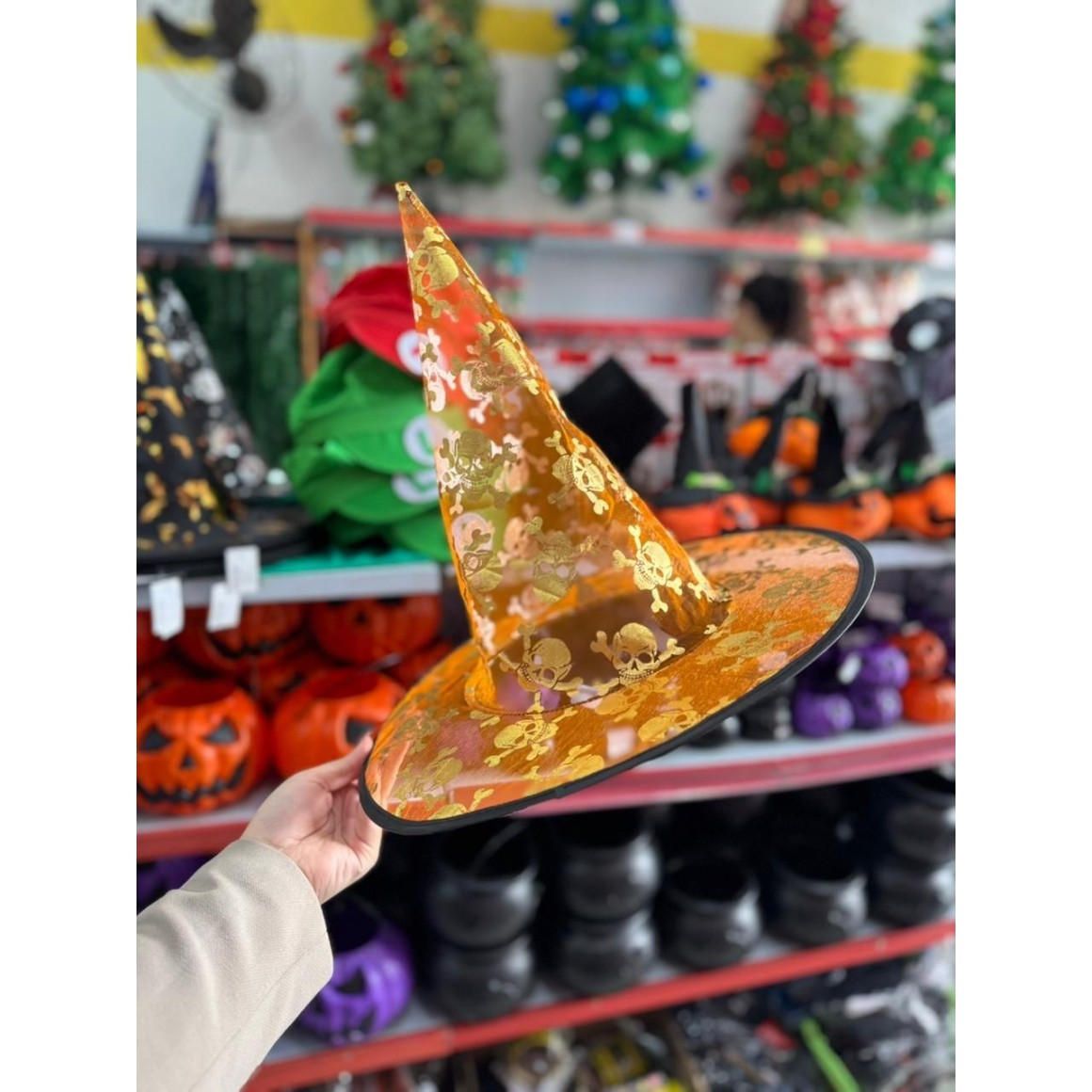Entre no clima do Halloween com o Chapéu de Bruxa Dourado com Caveiras, o acessório perfeito para completar sua fantasia ou decorar ambientes temáticos.