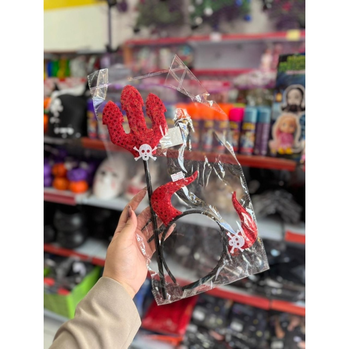 Destaque-se nas festas de Halloween com o Kit Diabinha com Tiara e Varinha, um conjunto divertido e cheio de brilho.
