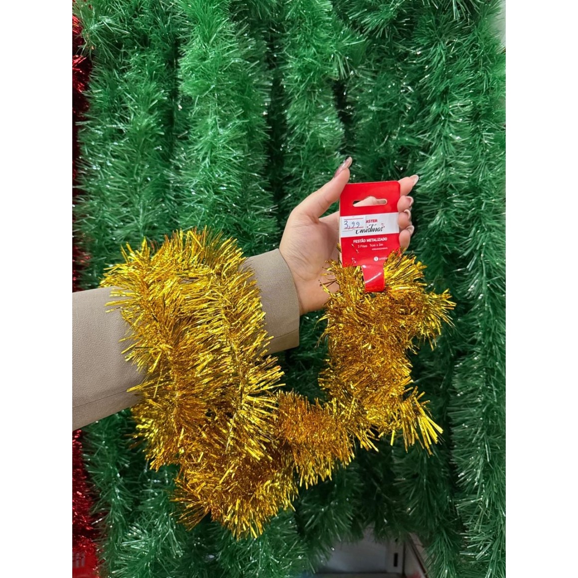 Cor dourado metalizada, com efeito reflexivo que destaca a iluminação natalina.
