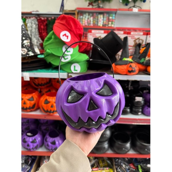 Balde em formato de abóbora roxa com expressão assustadora e detalhes em preto, ideal para festas e decorações de Halloween. Pode ser usado tanto como enfeite temático quanto para armazenar e distribuir doces durante brincadeiras e eventos. Possui alça plástica flexível para facilitar o transporte.