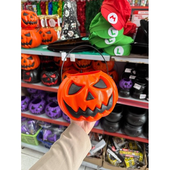 Balde em formato de abóbora laranja com rosto esculpido em preto, ideal para decoração de Halloween, eventos temáticos e brincadeiras de “Gostosuras ou Travessuras”. Feito em plástico leve e resistente, possui acabamento brilhante e alça plástica móvel para facilitar o transporte. É perfeito para armazenar doces, decorar mesas ou compor vitrines temáticas.