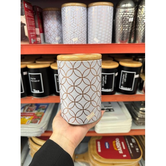 O Pote Decorativo com Tampa de Bambu é a escolha ideal para quem busca unir elegância e funcionalidade na organização da cozinha. Feito em aço galvanizado de alta qualidade, ele possui um acabamento branco com estampa geométrica dourada, proporcionando um toque moderno e sofisticado à decoração.