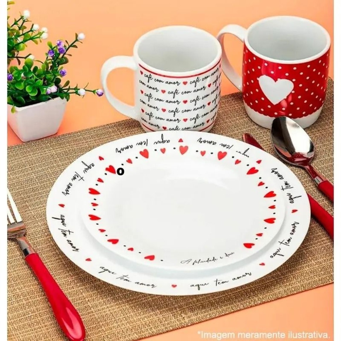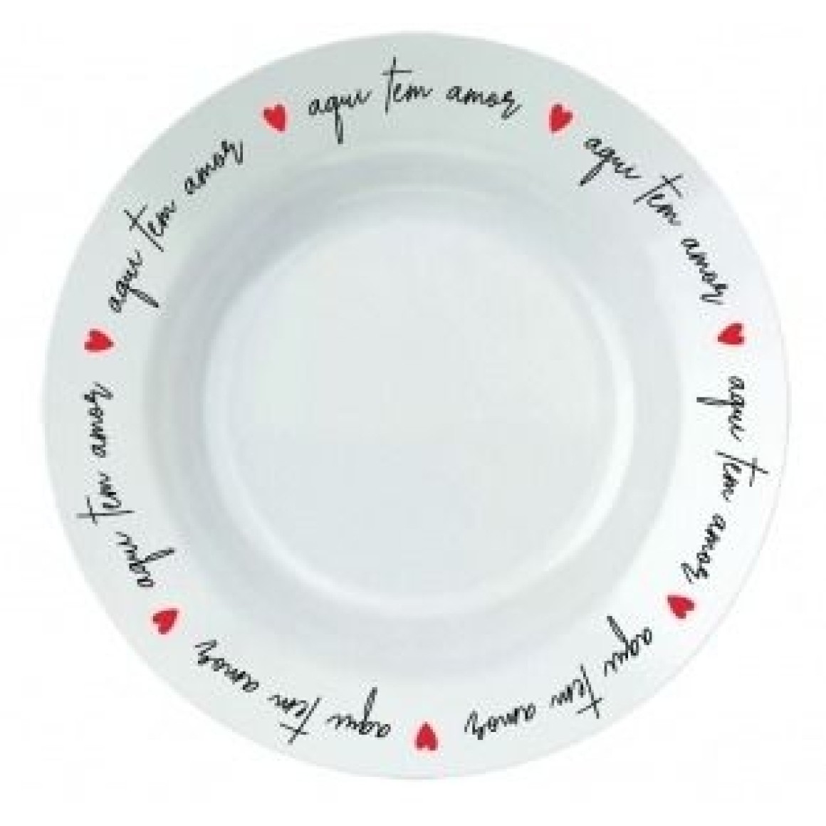 Produzido em vidro resistente, possui acabamento brilhante e estampa delicada com corações vermelhos e a frase “aqui tem amor”, que traz um toque de carinho e elegância para qualquer refeição.