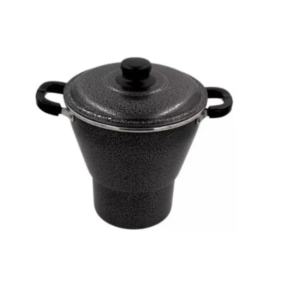 Cuscuzeiro de tamanho N° 10, ideal para o preparo de porções individuais ou pequenas de cuscuz tradicional (nordestino) cozido a vapor. O revestimento externo craquelado (ou marmorizado) confere ao produto alta resistência e um visual moderno. Por ser menor que o N° 12, é prático para o uso diário e otimiza o tempo de cozimento.