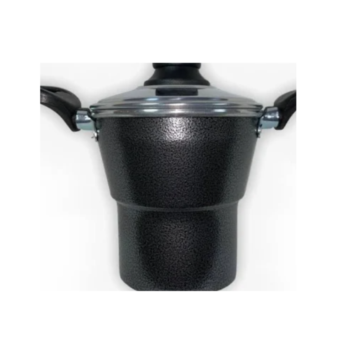 Cuscuzeiro individual ou familiar de tamanho N° 12, com capacidade para aproximadamente 1 Litro. Ideal para o preparo rápido e prático de cuscuz tradicional (nordestino) cozido a vapor. O acabamento craqueado (ou marmorizado) no revestimento externo confere durabilidade e um visual diferenciado ao produto. Compatível com diversos tipos de fogões (Gás, Elétrico).