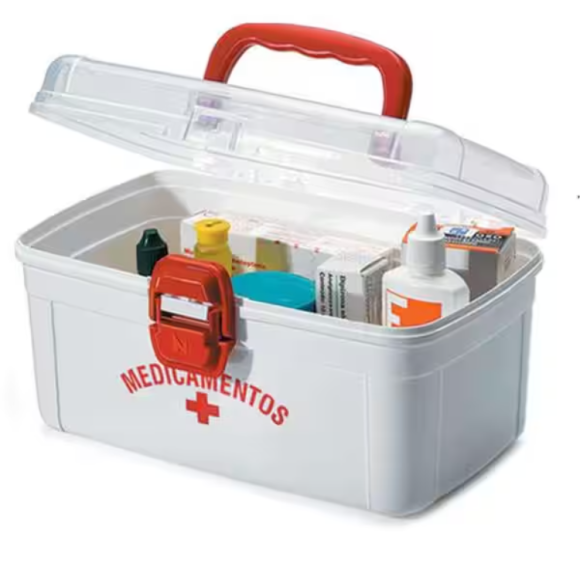 Seu design funcional conta com tampa com trava segura e alça superior para transporte, além de divisórias internas que facilitam a organização dos medicamentos e acessórios de uso frequente.