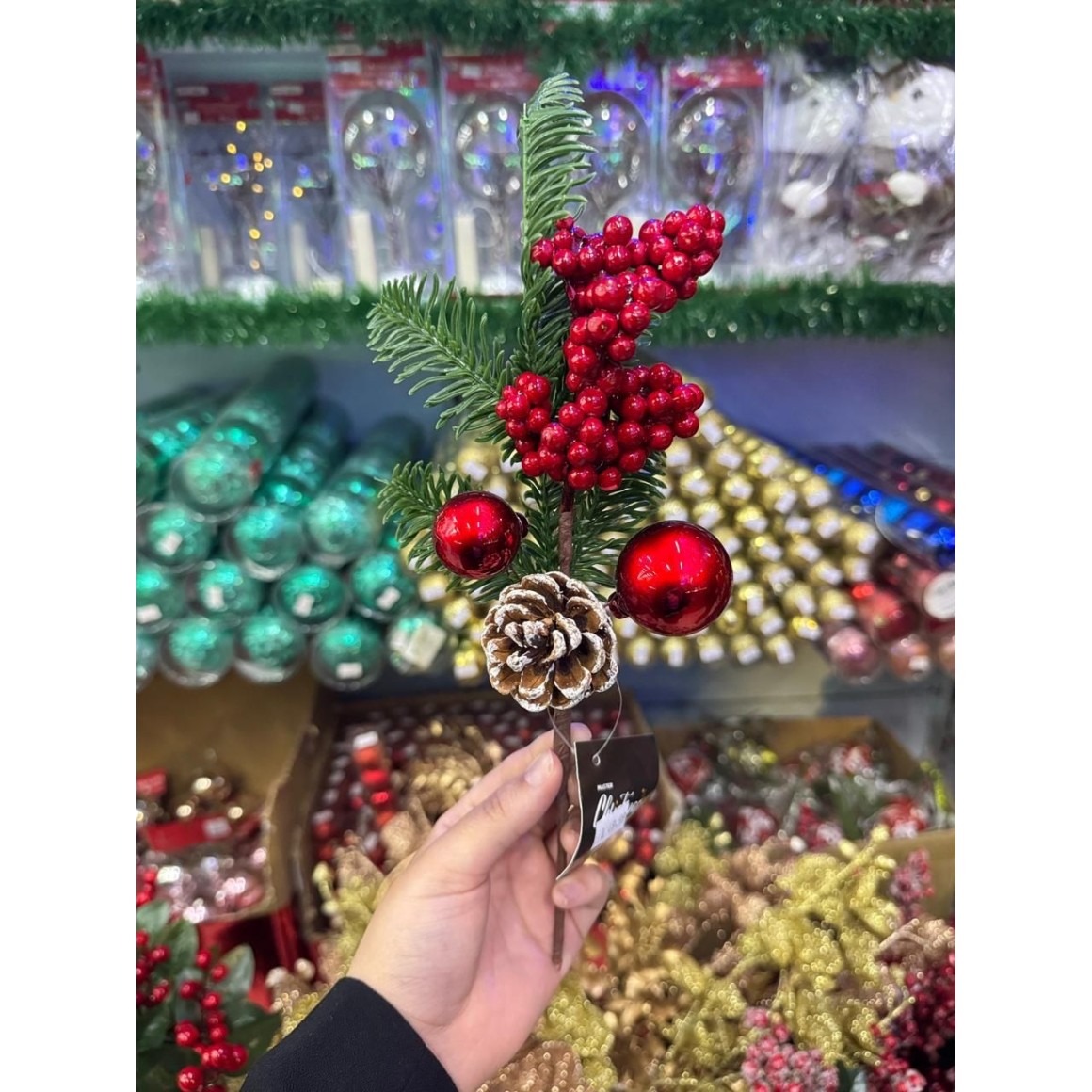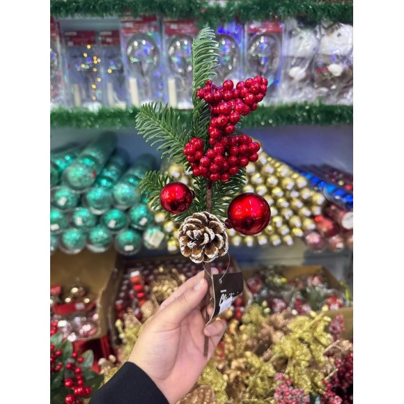Complete sua decoração com elegância usando o Pick Natalino de Azevinhos com Bolas e Vinhas, um item perfeito para arranjos, guirlandas, árvores de Natal, centros de mesa e projetos artesanais.