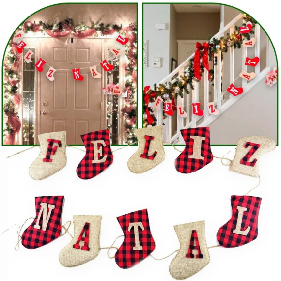 Deixe sua decoração natalina ainda mais charmosa com o Varal Decorativo Cordão de Botas “Feliz Natal”. Com mini botinhas em tecido vermelho e xadrez, presas por pequenos pregadores rústicos, este enfeite cria um efeito aconchegante e festivo ideal para salas, vitrines, portas, janelas, mesas ou painéis decorados.