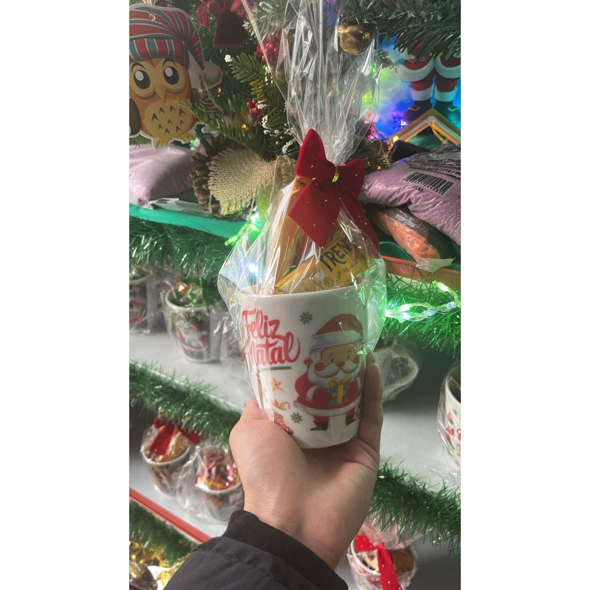 Kit presente cuidadosamente montado, ideal para demonstrar carinho e celebrar a época natalina. O conjunto é centrado em uma charmosa Caneca de Cerâmica com estampa exclusiva "Feliz Natal", decorada com motivos temáticos como Papai Noel, boneco de gengibre e meias de Natal nas cores vermelho e verde.
